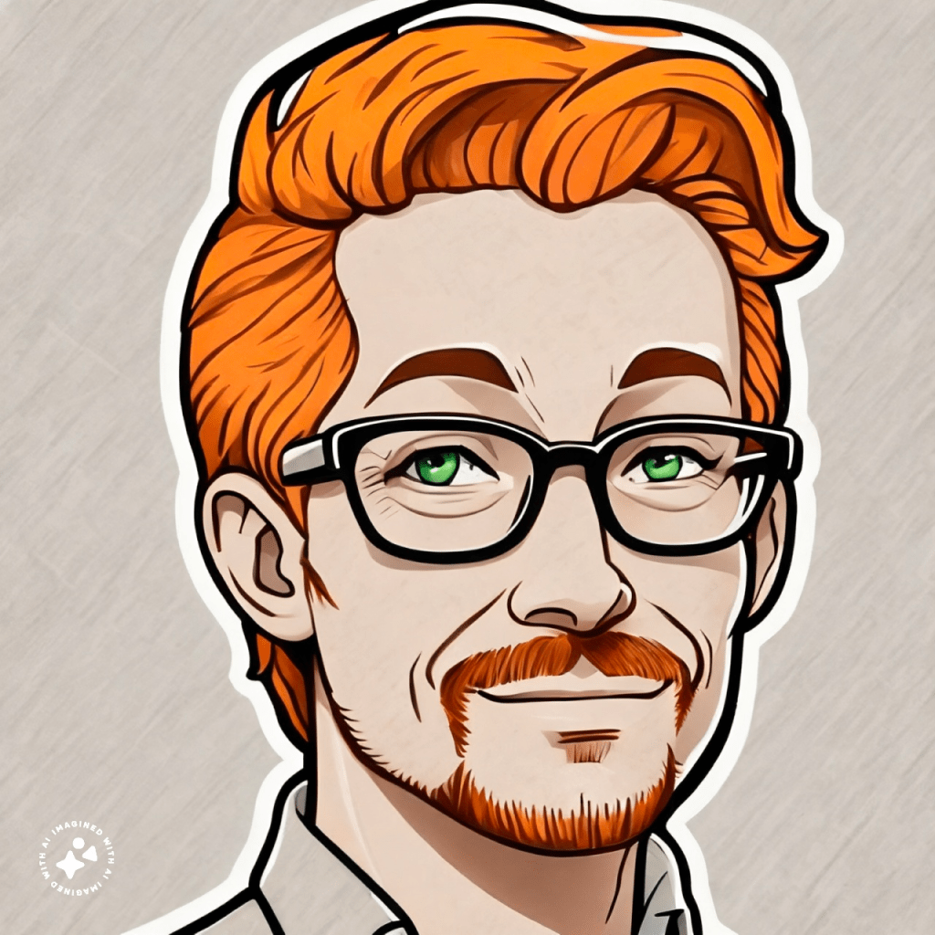 Prompt: ‘Man with auburn hair that’s a little blond, green eyes, glasses, a goatee and a small smile in the style of simple, line-art cartoons with minimal details, Like XKCD but with eyes.”