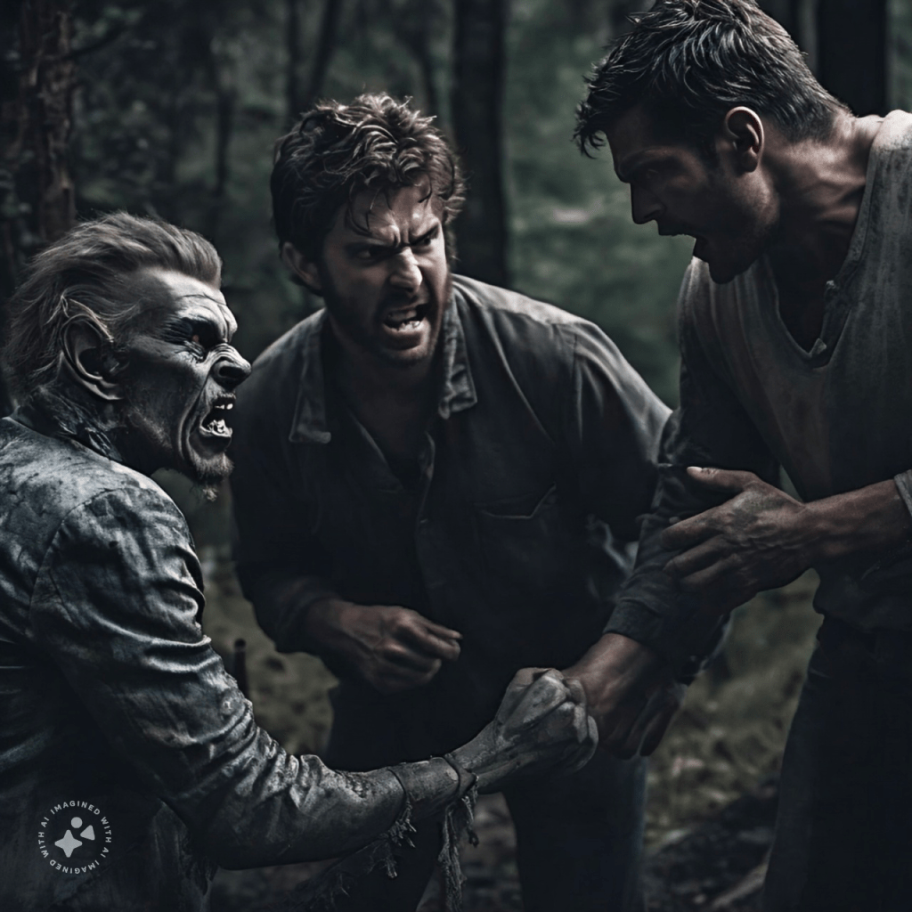Oh well, I might as well finish out this experiment. Prompt for panel four. Guy two, stricken: “My god! Werewolves.” Guy One: “LUCKY Werewolves.” Guy Three: “I’ll get the silver bullets.”