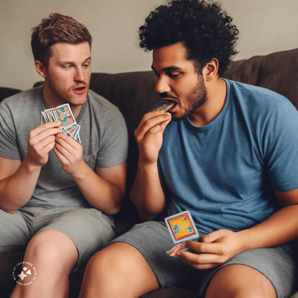 Prompt “Two guys are casually sitting on the couch snacking on pokemon cards. They are both eating the cards as if they are potato chips even though cards aren’t food.”